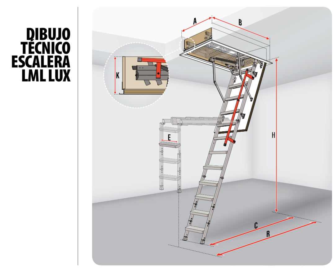 - El mecanismo oculto en el lateral ayuda a plegar y desplegar la escalera.
